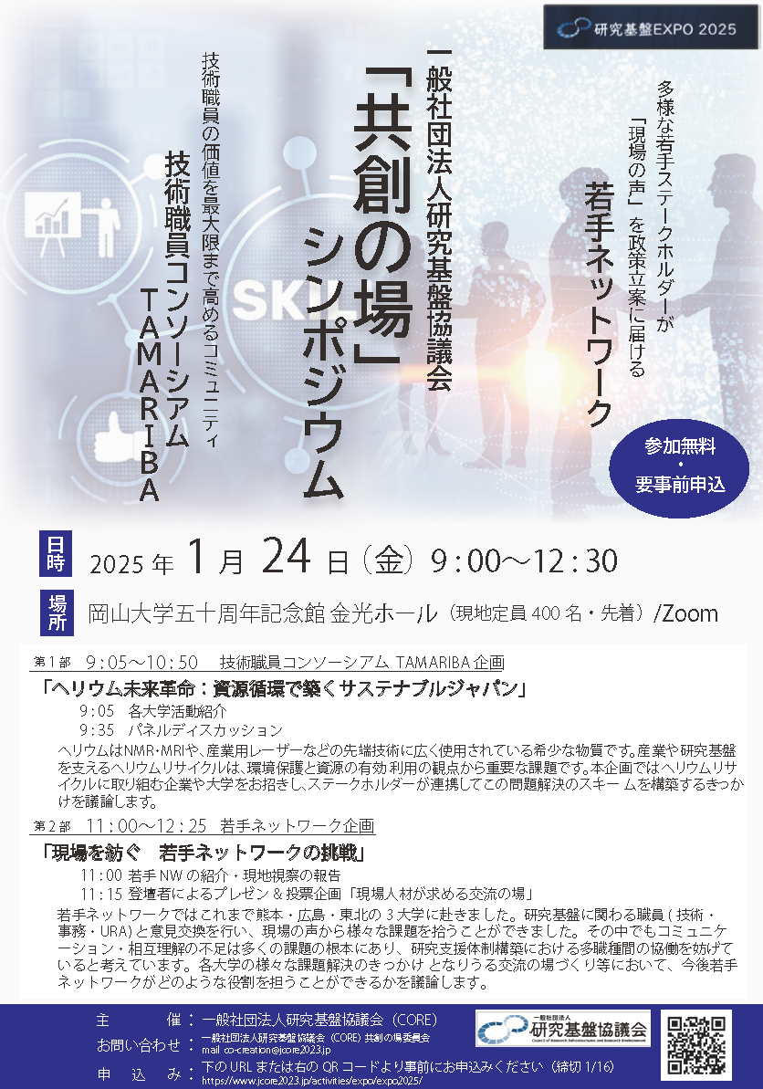 | 1月24日(金) | ![]() | 9:00-12:30 研究基盤協議会「共創の場」シンポジウム 第一部:ヘリウム未来革命:資源循環で築くサステナブルジャパン 東京大学 琉球大学 大阪大学 岡山大学 第二部:現場を紡ぐ 若手ネットワークの挑戦 発表資料 | 研究基盤協議会 | 岡山市 | ハイブリッド |