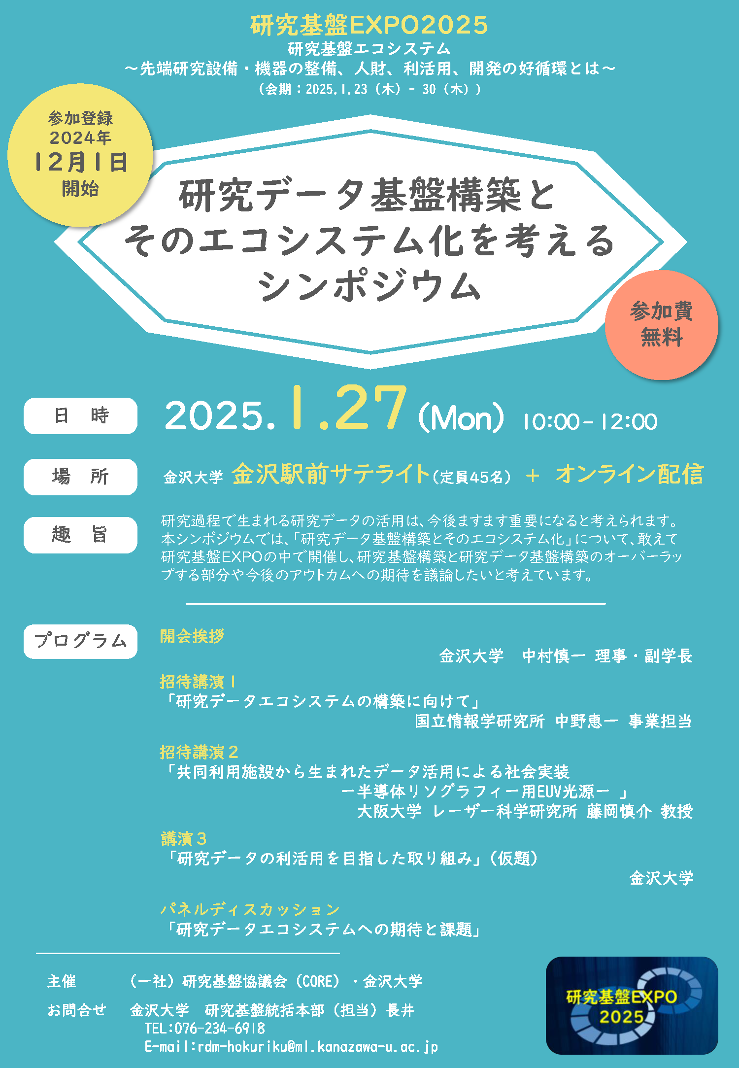 | 1月27日(月) | ![]() | 10:00-12:00 研究データ基盤構築とそのエコシステム化を考えるシンポジウム | 金沢大学 | 金沢市 | ハイブリッド |