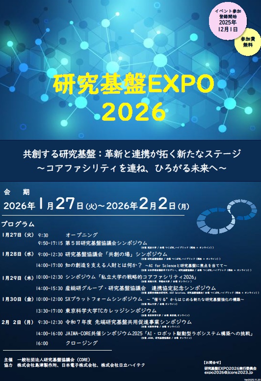 | 1月29日(木) | 10:00-12:30 シンポジウム「私立大学の戦略的コアファシリティ2026」 | 東海大学、早稲田大学 | ーーー | オンライン | |